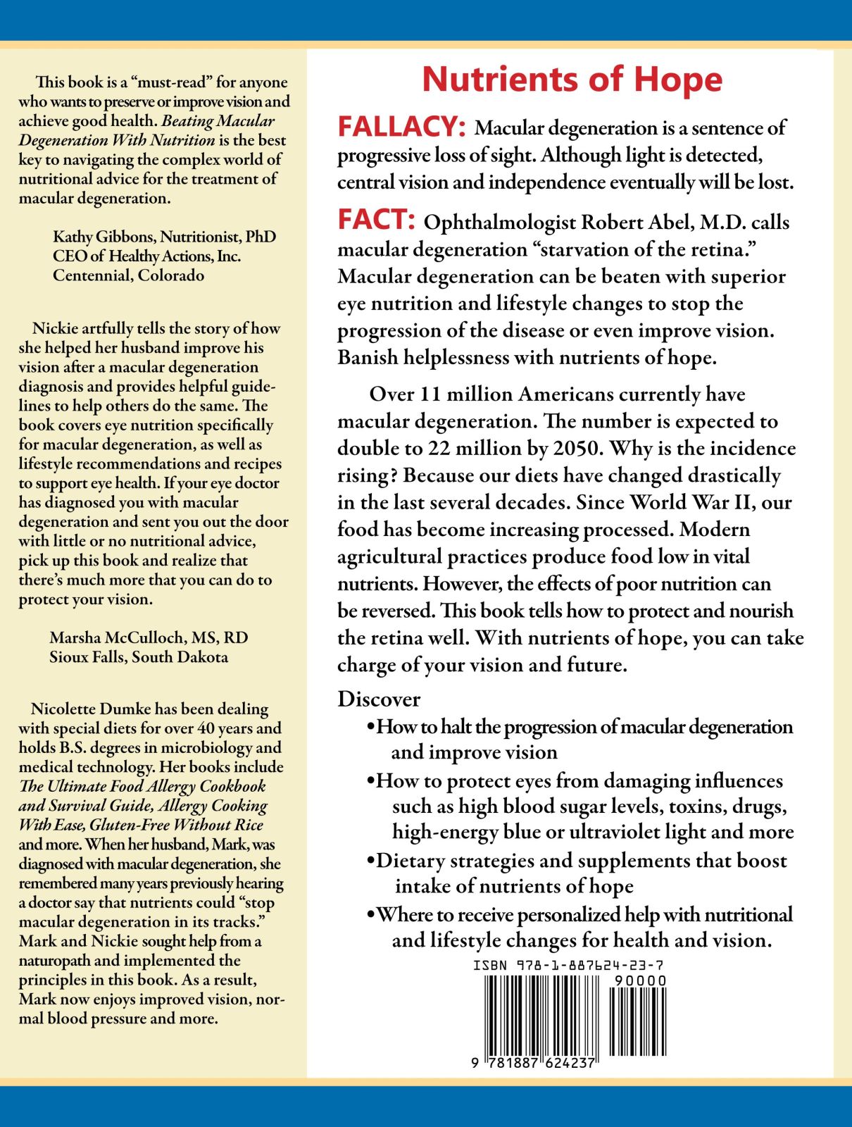 TO PURCHASE Allergy Cooking with Ease, Pandemic Preparedness (3rd) Edition from amazon click here. Beating Macular Degeneration With Nutrition gets to the root cause of macular degeneration, "starvation of the retina,"[1] as well as other influences on eye health such as ultraviolet and high energy blue light, toxins, drugs, blood sugar control, inflammation and exercise. It contains practical help for improving your nutrition such as 95 recipes, nearly all of which are gluten-free and food allergy friendly yet will be enjoyed by everyone. Also included is a "Sources" section for special foods, products and sources of help. Stop the progression of macular degeneration and save your sight! For more information about the book (including a look inside) click here.