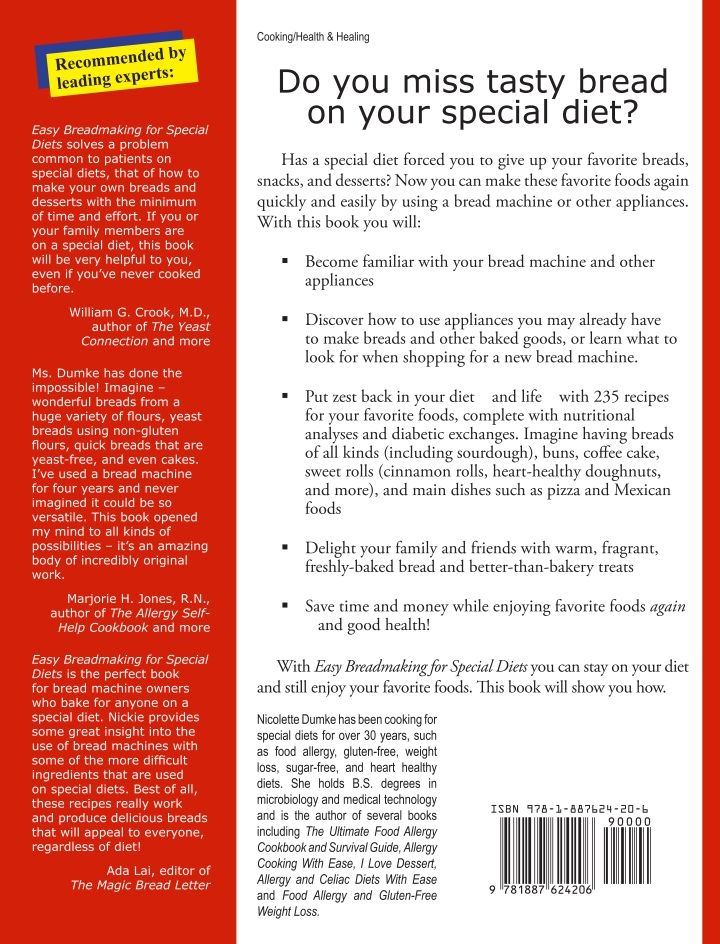 Easy Breadmaking for Special Diets contains over 235 recipes for allergy, heart healthy, low fat, yeast-free, diabetic, and gluten-free diets. It includes recipes for breads of all kinds (including machine-made sourdough – several varieties of wheat- and gluten-free sourdough and some made with wheat), bread and tortilla based main dishes, and desserts. The allergy recipes are made with a wide variety of grains such as spelt, rice, rye, kamut, amaranth, barley, buckwheat, oat, and quinoa and include yeast breads, non-yeast breads, and tortillas. The book discusses what features to look for when you buy a bread machine and how to choose the machine that best meets your needs. If you are struggling to find enough time to make special bread, this book can be a lifesaver.