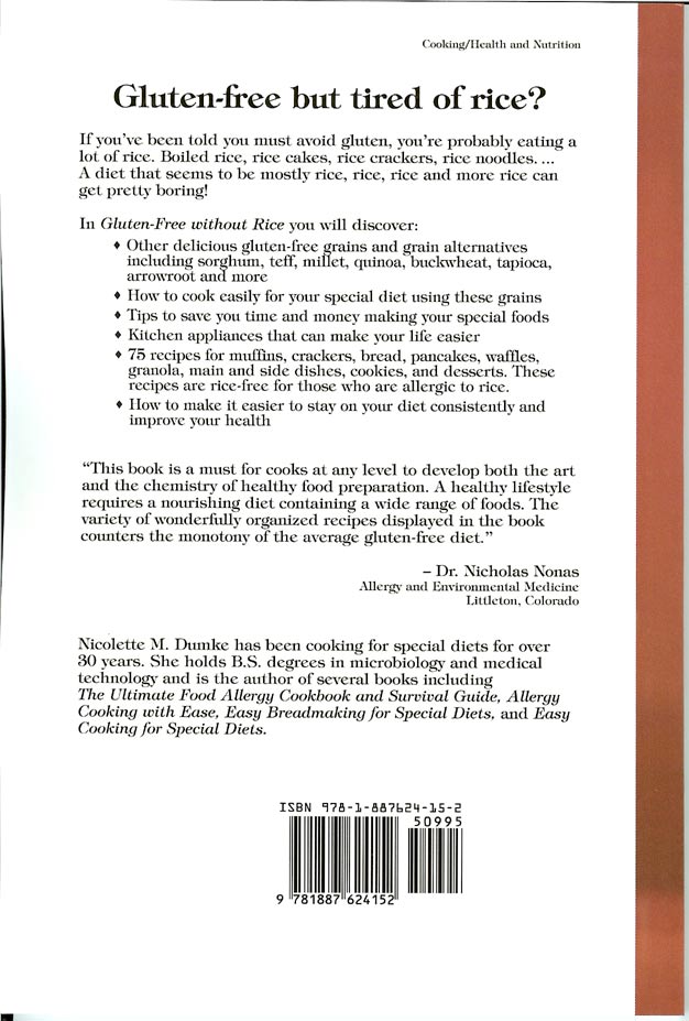 Gluten-Free Without RiceEasy Cooking for Variety on a Gluten-Free DietIf you are on a gluten-free diet and are tired of or allergic to rice, Gluten-Free Without Rice will give you the help you need. It introduces other delicious gluten-free grains such as sorghum, teff, millet, quinoa, amaranth, buckwheat, tapioca, arrowroot and more. It will help you cook easily – and save time doing it – while staying on your diet consistently and improving your health. This book contains over 75 recipes for muffins, crackers, bread, pancakes, waffles, granola, main and side dishes, cookies and desserts. You will also get time-saving tips on how to cook for and cope with your diet, references, and a listing of sources of special foods and products for those on gluten-free diets. For a look inside this book, click here.